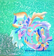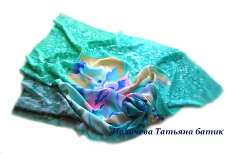 Шелковый платок батик "Морозный узор", стильный, красивый аксессуар. Все углы платка имеют свой оттенок, бирюзового, мятного и цвета морской волны. Натуральный шелк высокого качества, с легким блеском.