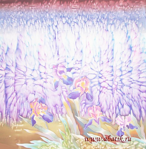 Батик платок, очень нежных оттенков сиреневого и голубого цветов. Ирисы ярко-фиолетового тона.