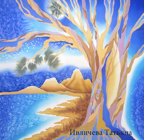 батик платок шелковый "Море, берег, горы..."