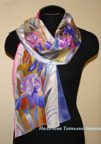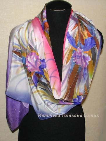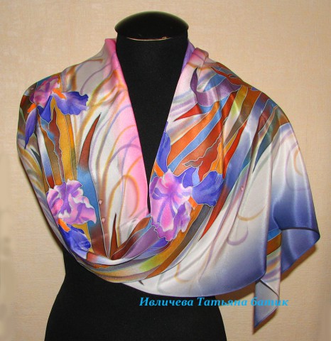 Шелковый шарф с нежным, воздушным рисунком. Изящные цветы Ирисов, обрамлены короной листвы мятно-серых, серо-сиреневых, бежево-серых, оливковых, серо-голубых, террактовых тонов.