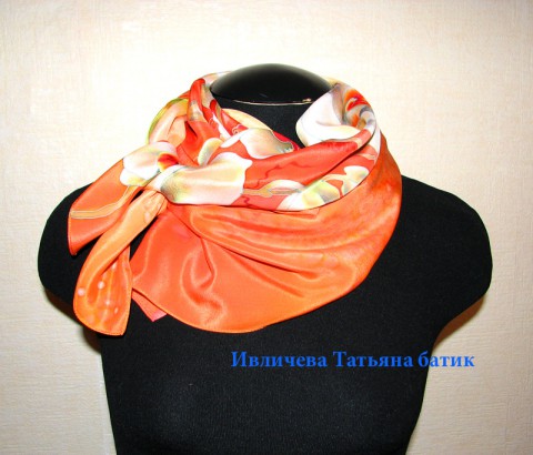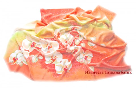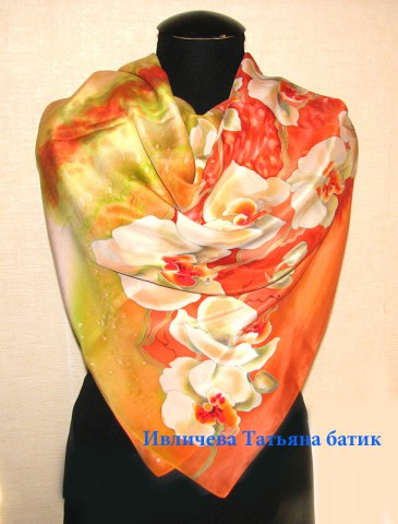Шикарный шелковый платок батик с авторским рисунком орхидей понравится любой женщине. Теплые цвета в которых расписан платок, подчеркнут вашу индивидуальность и добавят изюминку в стиль одежды. Великолепное качество натурального шелка порадует, легким перламутровым блеском и приятной бархатистостью.