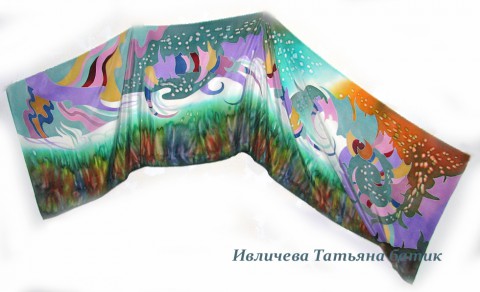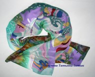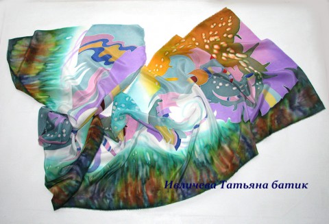 Шелковый шарф с авторским , абстрактным рисунком. В мятно-зеленой цветовой гамме, шарфа хорошо сочетаются сиреневый, розово-сиреневый, хаки, светлый изумрудный, темный синий, песочный, бордовый.