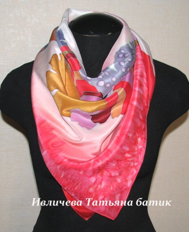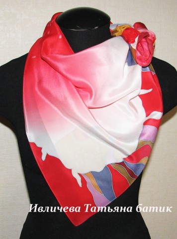 Весенний, стильный, шелковый платок батик, для уверенных в себе женщин. В ярком платке Вы будете эсктравагантны и неотразимы. Красный цвет платка, ближе к холодному, клюквенному цвету.