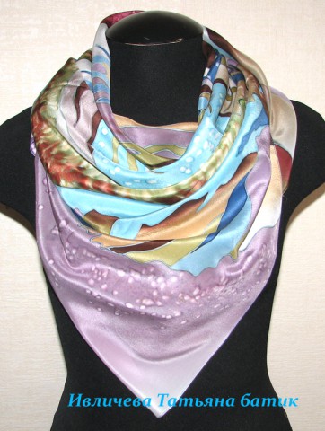 Платок с ручной росписью и абстрактным рисунком в холодных тонах. Основной цвет на шелковом платке сиреневый слегким оттенком серого в сочетании с бирюзовым, синим, оливковым, светлым песочным и шоколадным цветами.