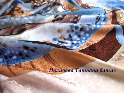 Дарить хочется, что-то исключительное, эксклюзивное. Платок батик расписан на натуральной шелковой, жаккардовой ткани. Жаккард плотнее крепдешина, т.к. шелк имеет тканный рисунок и прекрасно греет зимой. Цветовая гамма платка батик, создана в серых, бежевых, шоколадных и темно-синих тонах.