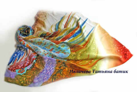Шелковый платок "Стрекоза" с авторской росписью и красивой цветовой композицией, подчеркнут вашу индивидуальность.
