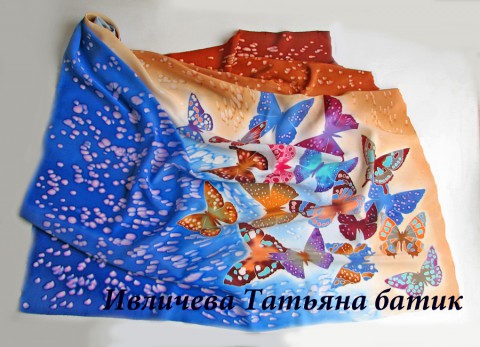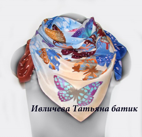 Платок батик "Бабочки", расписан в спокойной цветовой гамме: голубой,бежевой.