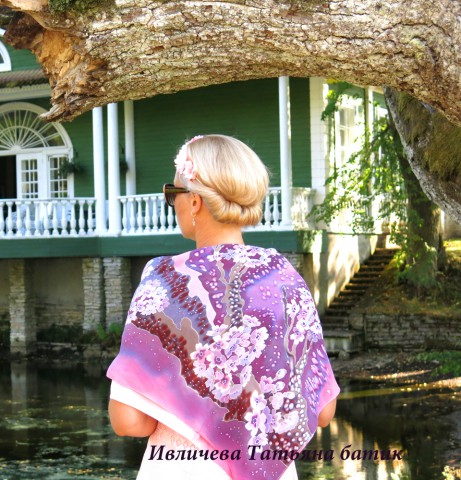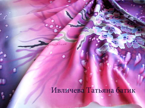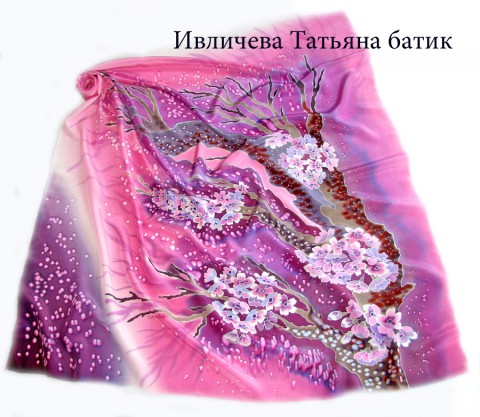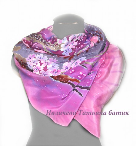 Платок батик "Cакура", расписан в розовых и сиреневых тонах.