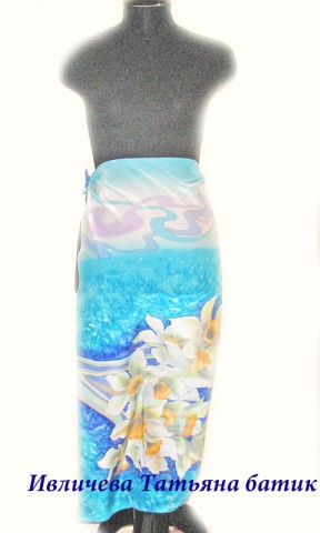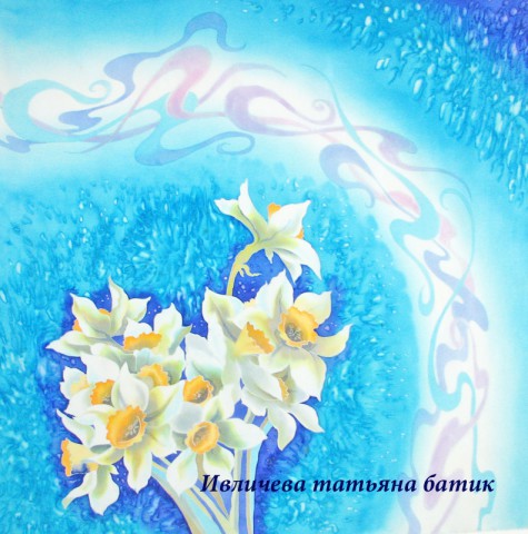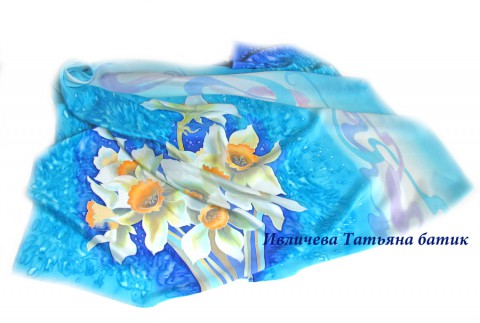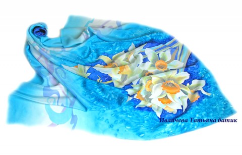 Авторский платок бирюзового цвета, с рисунком нарциссов.