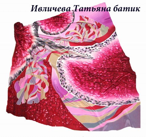 Платок батик "Вишневый сад", расписан в ручную, в бордовых и розово-сиреневых тонах. Авторская работа, в единственном экземпляре.