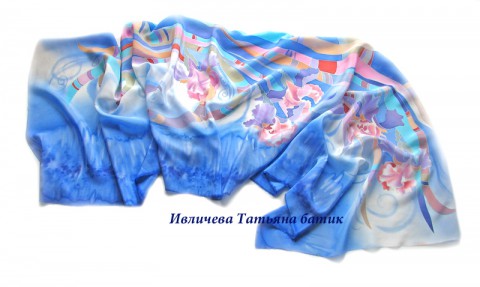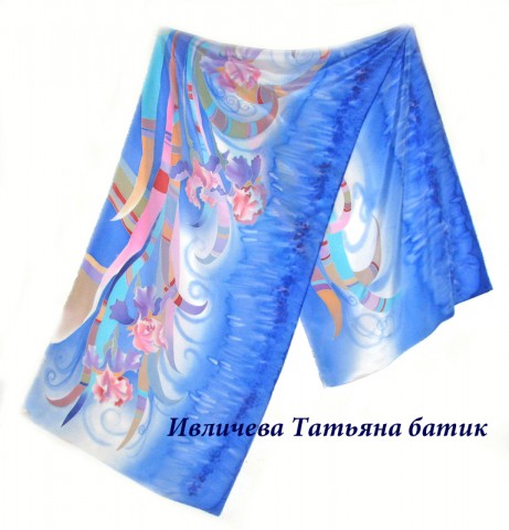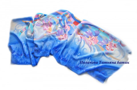 Шелковый шарф батик, расписан в нежной голубой цветовой гамме, на натуральном шелке великолепного качества с легким перламутровым блеском.
