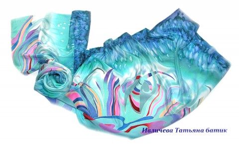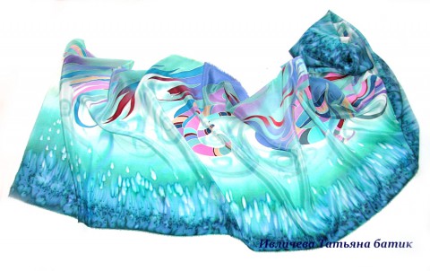Батик шарф "Травушка-муравушка", авторская роспись. Заинтересует любительниц модных, дизайнерских шарфов, своими благородными сочетаниями цветов, мятного с добавлением бирюзового, розового, сиреневого и капельки бордового и темно-синего. Эксклюзивный шелковый аксессуар может быть великолепным подарком женщине, у которой все есть, а такого шелкового шарфа точно нет. Он в единственном экземпляре. Мягкий, струящийся шелк высокого качества.